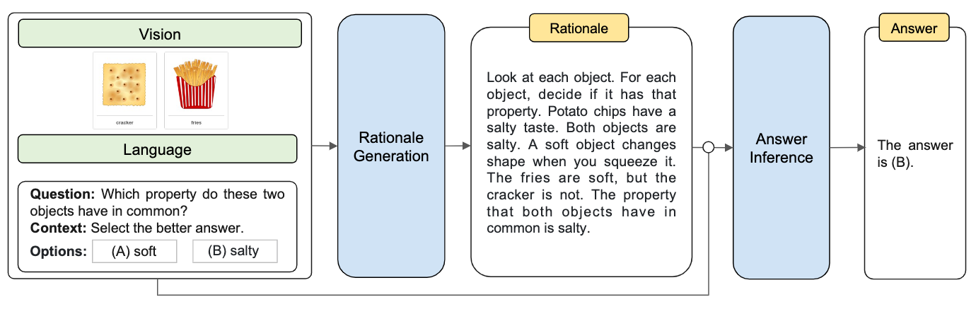 Amazon’s 'Multimodal Chain-of-Thought Reasoning in Language Models' took it further and created a Multimodal-CoT that incorporates language (text) and vision (images) modalities. The model is not trained to choose B based on keywords(cracker, fries). Instead, it has the rationale generated given language and vision inputs, put the rationales and the original inputs together, then infer the answer. For every specific step, the model is still using the primitive mind. But as the whole procedure, it simulates the process of higher-mind thinking.