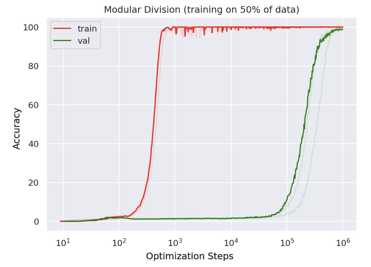 Grokking, which might be paraphrased as "epiphany", describes the phenomenon where a neural network can suddenly generalize when it continues optimizing after achieving perfect training accuracy. You can think of it as a model going through an "aha moment." It was observed for the first time in 2022 by OpenAI. Intuitively, Grokking is a nonlinear occurrence that has no concrete explanation yet. The answer may lie among (or in the combination of) the three cutting edge research areas in AI: Chain-of-Thought(CoT), Emergent Abilities, and In-Context Learning.