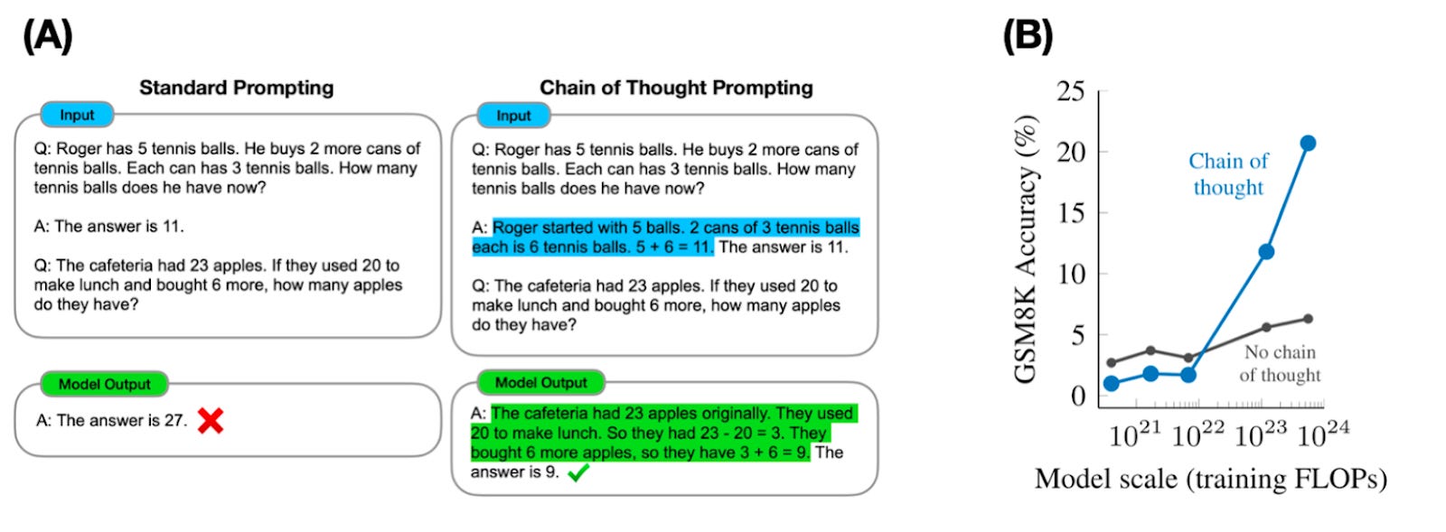 From the Stanford and Google paper 'Emergent Abilities of Large Language Models', you can see the nonlinearity and the ‘threshold’ nature of COT. As shown in (A) below, COT prompting can significantly improves reasoning abilities of large language models, allowing them to solve multi-step problems that require abstract reasoning, such as math word problems. As shown in (B), chain-of-thought prompting performs worse than directly returning the final answer until a critical size (10^22 FLOPs), at which point it does substantially better.